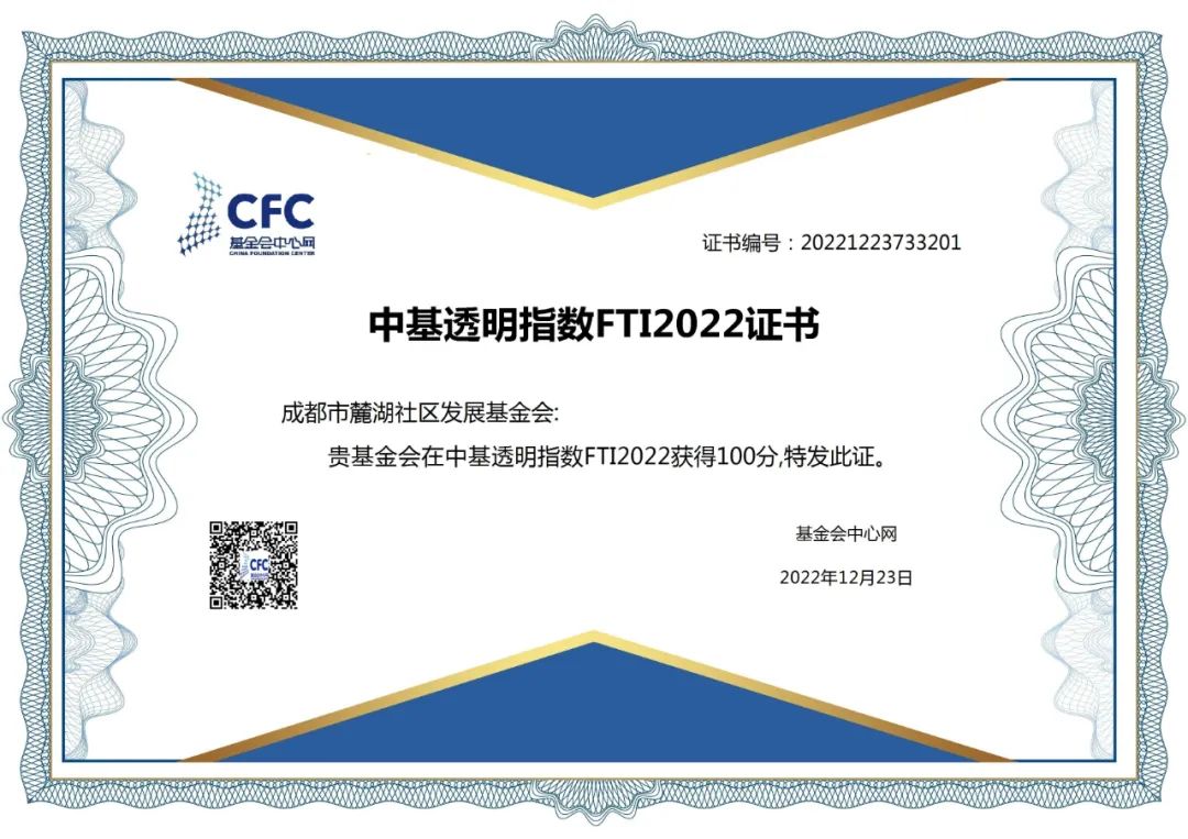 麓湖社区基金会是经由四川省民政厅审核批准,正式注册成为一家具有独立法人资格的公益组织。2022年,麓湖社区基金会荣获全省性社会组织评估等级4A级,并连续数年获得中国基金会透明指数FTI满分。