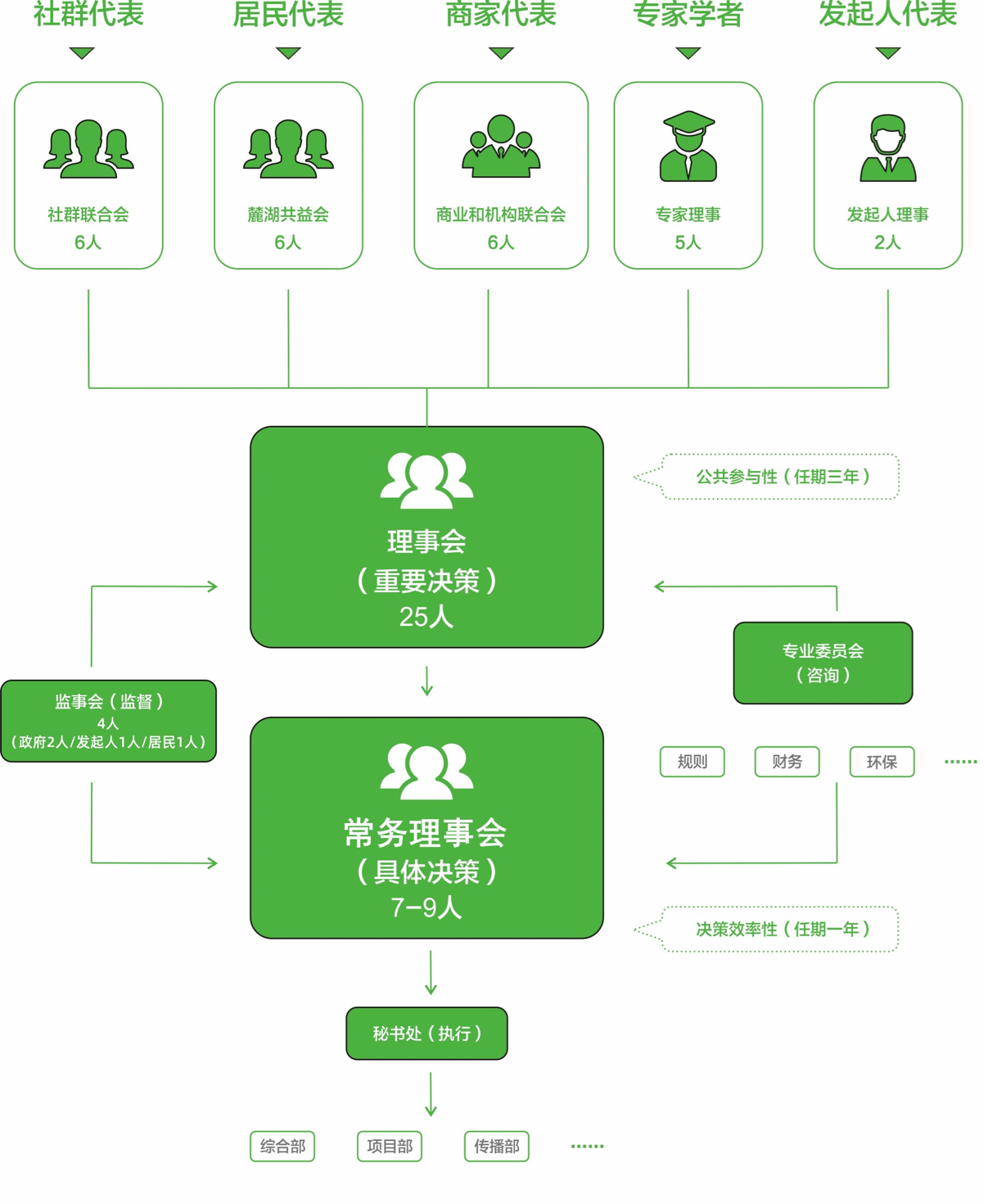 麓湖社区基金会分别设置了理事会(常务理事会)、监事会、专业委员会及秘书处,目前主要围绕资绿色环保、儿童友好、协商议事、社群培育、社区节日、文化艺术、体育健康、创新孵化、残障融合持续开展工作,项目受益人群从社区面向四川全省。